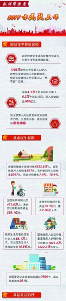 “民政工作關(guān)系民生、連著民心,是社會建設(shè)的兜底性、基礎(chǔ)性工作。”2019年4月2日在北京召開的第十四次全國民政會議,傳達(dá)了習(xí)近平總書記對民政工作作出的重要指示。 認(rèn)真貫徹習(xí)近平總書記重要指示精神,一年來,各級民政部門緊緊圍繞中心、堅決服務(wù)大局,深化改革創(chuàng)新,各項工作取得新進(jìn)展、新成效。 兜底保障能力明顯增強(qiáng) 河北、廣西等創(chuàng)新落實(shí)特殊困難群體“單人戶”低保政策,云南系統(tǒng)規(guī)范完善農(nóng)村低保制度,陜西統(tǒng)籌構(gòu)建“六張保障網(wǎng)”,甘肅、青海等部署開展脫貧攻堅沖刺清零篩查專項行動。加大羅霄山片區(qū)扶貧和定點(diǎn)扶貧縣扶貧力度,江西遂川縣、蓮花縣實(shí)現(xiàn)脫貧摘帽…… 2019年,聚焦打贏精準(zhǔn)脫貧攻堅戰(zhàn),民政兜底保障能力明顯提升—— 出臺加強(qiáng)分散供養(yǎng)特困人員照料服務(wù)、強(qiáng)化臨時救助兜底保障政策;將資金和各項政策措施向“三區(qū)三州”等深度貧困地區(qū)傾斜;深入開展農(nóng)村低保專項整治; 廣泛引導(dǎo)和動員社會組織特別是慈善組織參與脫貧攻堅,全國4.1萬個社會組織開展6.2萬個扶貧項目,投入資金超過600億元; …… 各地民政部門群策群力,發(fā)達(dá)省份加強(qiáng)對口幫扶,貧困地方聚力攻堅,1796萬建檔立卡貧困人口納入農(nóng)村低?;蛱乩藛T救助供養(yǎng),繼續(xù)保持農(nóng)村低保標(biāo)準(zhǔn)動態(tài)達(dá)到或超過國家扶貧標(biāo)準(zhǔn)。 在全力做好脫貧攻堅工作的同時,民政部門穩(wěn)步提升基本民生保障水平,更好滿足廣大困難群眾和特殊群體的基本需求—— 加大對生活困難下崗失業(yè)人員基本生活的保障力度,針對部分食品價格上漲,及時啟動社會救助和保障標(biāo)準(zhǔn)與物價上漲掛鉤聯(lián)動機(jī)制; 建立事實(shí)無人撫養(yǎng)兒童國家保障制度,填補(bǔ)了兒童福利領(lǐng)域制度的空白,大約50萬事實(shí)無人撫養(yǎng)兒童從2020年1月1日起將獲得由政府發(fā)放的基本生活補(bǔ)貼; 聯(lián)合財政部、中國殘聯(lián)建立殘疾人兩項補(bǔ)貼標(biāo)準(zhǔn)動態(tài)調(diào)整機(jī)制,分別涉及1000多萬、1300多萬殘疾人; 加大慈善事業(yè)促進(jìn)力度,截至2019年11月底,全國登記認(rèn)定慈善組織超過7500個,成立慈善信托261筆。 基層社會治理進(jìn)一步夯實(shí) 10月29日下午5點(diǎn),貴州都勻市,幾十個小學(xué)生陸續(xù)放學(xué),來到了思源社區(qū)辦公樓。在閱覽室里,都勻市十三小學(xué)二年級一班的彭興寶拿出作業(yè)本,寫了一會兒,“小黑甲”指出了他的一處錯誤。 “穿‘小黑甲’的都是‘四點(diǎn)半課堂’的社工?!痹诙紕蚴忻裾种С窒拢?4名社工來到社區(qū),承擔(dān)了課外輔導(dǎo)老師的角色。 夯基礎(chǔ),強(qiáng)基層,是近年來民政工作的一項重點(diǎn)。 2019年,民政部門強(qiáng)化黨領(lǐng)導(dǎo)基層群眾自治和社會組織管理,基層社會治理進(jìn)一步夯實(shí)—— 實(shí)施城鄉(xiāng)社區(qū)服務(wù)體系建設(shè)規(guī)劃,加快發(fā)展社區(qū)生活性服務(wù),截至2019年11月底,全國城鄉(xiāng)社區(qū)綜合服務(wù)設(shè)施覆蓋率分別達(dá)到78.6%和46.1%; 強(qiáng)化社會組織管理和監(jiān)督,出臺加強(qiáng)社會組織政治建設(shè)、規(guī)范行業(yè)協(xié)會商會涉企收費(fèi)等政策規(guī)定,全面推開行業(yè)協(xié)會商會脫鉤改革,常態(tài)化公開社會組織違法失信名單信息; 社工人才隊伍和志愿者隊伍建設(shè)取得新進(jìn)展,舉辦首次高級社會工作師考試,志愿服務(wù)隊伍持續(xù)壯大,截至12月20日,全國注冊志愿者逾1.39億,志愿服務(wù)18億小時; …… 行政區(qū)劃調(diào)整和地名清理規(guī)范,也是社會各界尤其是基層群眾關(guān)注的一項重要工作。 2019年,民政部門報請國務(wù)院批準(zhǔn)縣級以上行政區(qū)劃調(diào)整事項20件,優(yōu)化8個大中城市市轄區(qū)規(guī)模結(jié)構(gòu),新增12個中小城市,探索特大鎮(zhèn)設(shè)市模式,建成并上線了中國·國家地名信息庫;聯(lián)合舉辦《中國地名大會》;完成14條省界聯(lián)檢和3條省界界樁更換。 基本社會服務(wù)水平更大幅度提升 “婚姻登記的效率那叫一個‘十分快’?!苯衲?月14日,在廣州市白云區(qū)民政局婚姻登記處的服務(wù)大廳,王佳和妻子手捧大紅色的結(jié)婚證,幸福滿滿。 “早就想到今天會人山人海,以為會排很長時間的隊,真想不到會這么快,還不用花一分錢?!蓖跫验_心地說。 “全城通辦”、網(wǎng)上預(yù)約讓婚姻登記“快”了,取消婚姻登記費(fèi)則讓結(jié)婚成本“降”了。這些變化,得益于民政部門在婚姻登記服務(wù)方面的新舉措。 2019年,民政部門著力打通難點(diǎn)堵點(diǎn),提升基本社會服務(wù)水平—— 婚姻檔案的信息化工作基本完成,加強(qiáng)涉外婚姻管理,持續(xù)提高婚姻登記規(guī)范化水平; 牽頭建立養(yǎng)老服務(wù)部際聯(lián)席會議機(jī)制,取消養(yǎng)老機(jī)構(gòu)設(shè)立許可,規(guī)范備案管理,深化居家社區(qū)養(yǎng)老服務(wù)改革試點(diǎn),推進(jìn)解決大城市養(yǎng)老難問題,持續(xù)推進(jìn)養(yǎng)老院服務(wù)質(zhì)量專項行動; 聯(lián)合11個部門開展違法違規(guī)私建“住宅