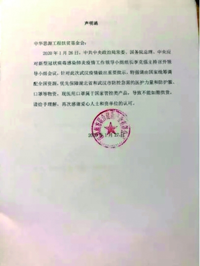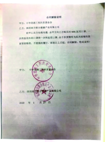 ■ 本報記者 張明敏 1月29日,因沒有達成執(zhí)行意向,湖北省紅十字基金會向中華思源工程扶貧基金會(以下簡稱“思源工程”)退還1900余萬元善款,并在微博發(fā)布付款回單。但隨即有網(wǎng)友指出,該付款回單上,收款人開戶行中的“支行”被誤寫作“之行”,且退還金額少了20萬元。 此外,有網(wǎng)友質(zhì)疑,思源工程在1月26日通過微博發(fā)布的防控物資采購公告中,所示的供貨方并不具備醫(yī)療口罩生產(chǎn)資質(zhì)。此外,思源工程2014年至2018年的五年累計捐贈收入比公益支出多出1.83億元,這筆余款的使用也引人關注。 1月31日,《公益時報》記者聯(lián)系思源工程副秘書長陶鳴,對這些質(zhì)疑進行了回應。 合同公示期 未撥付任何資金 陶鳴在接受《公益時報》記者采訪時表示:“向深圳南方聯(lián)合健康產(chǎn)業(yè)有限公司采購口罩一事屬實,該微博發(fā)布的采購合同尚在公示期,只是意向性購買,并未達成實質(zhì)性購買,所以僅有思源工程一方蓋章。公示期內(nèi)并未向?qū)Ψ街Ц抖ń鸹驌芨度魏慰铐棥!?/p> 對于網(wǎng)友提出供貨商深圳南方聯(lián)合健康產(chǎn)業(yè)有限公司供應資質(zhì)的問題,思源工程方面給記者傳來了幾張該公司的資質(zhì)圖片,包括營業(yè)執(zhí)照、醫(yī)療器械經(jīng)營許可證、二類醫(yī)療器械經(jīng)營備案憑證等。 有網(wǎng)友稱,曾致電深圳南方聯(lián)合健康產(chǎn)業(yè)有限公司求證向思源工程供貨一事,得到答復為“從未賣口罩給基金會”?!豆鏁r報》記者通過“天眼查”查詢到該公司負責人電話,但撥打后均被掛斷。 根據(jù)天眼查顯示,南方聯(lián)合健康產(chǎn)業(yè)有限公司經(jīng)營項目為“健康產(chǎn)業(yè)投資(具體項目另行申報);醫(yī)療設備的租賃、上門維護以及技術(shù)開發(fā);一類醫(yī)療器械的購銷及其它國內(nèi)貿(mào)易(法律、行政法規(guī)、國務院決定規(guī)定在登記前須經(jīng)批準的項目除外);興辦實業(yè)(具體項目另行申報);經(jīng)營進出口業(yè)務。(法律、行政法規(guī)、國務院決定禁止的項目除外,限制的項目須取得許可后方可經(jīng)營)。許可經(jīng)營項目是:經(jīng)營醫(yī)療器械的銷售(按醫(yī)療器械經(jīng)營企業(yè)許可證的審批項目經(jīng)營)?!?/p> 國家統(tǒng)籌調(diào)配資源 合同已取消 陶鳴表示,思源工程從武漢市衛(wèi)健委獲知需求信息后,1月26日,在詢價、談判期間,一方面要求深圳南方聯(lián)合健康產(chǎn)業(yè)有限公司提供采購協(xié)議(注明型號、數(shù)量、單價、總價)等信息,并在網(wǎng)上公示;另一方面立即派員趕往口罩生產(chǎn)地去核實標準、數(shù)量等事宜,公示期間思源工程并未支付定金或撥付任何款項。 由于思源工程采購的GB19083-2010標準N95口罩需求量大,春節(jié)期間第一時間要供貨,很難聯(lián)系上滿足符合標準和條件的生產(chǎn)廠、供貨商。多方聯(lián)系后,深圳南方聯(lián)合健康產(chǎn)業(yè)有限公司表示可以供應GB19083-2010標準的N95醫(yī)用口罩,價格為14元/個。 陶鳴說,在采購合同的詢價、談判公示階段,有網(wǎng)友對GB19083-2010標準的N95醫(yī)用口罩的價格有意見,為尊重網(wǎng)友意見,思源工程開始向社會各界征集價格更低的GB19083-2010標準N95口罩的相關信息。 1月26日,根據(jù)中央應對新型冠狀病毒感染肺炎疫情工作領導小組會議精神,“調(diào)配全國資源,優(yōu)先保障湖北省和武漢市急需的醫(yī)護力量和醫(yī)療物資”,深圳南方聯(lián)合健康產(chǎn)業(yè)有限公司不能如期供貨,便取消了合同。 思源工程向《公益時報》出示了一份落款蓋章為1月27日深圳南方聯(lián)合健康產(chǎn)業(yè)有限公司的聲明函,該函件稱1月26日,國務院會議針對武漢疫情做出重要批示,特強調(diào)由國家統(tǒng)籌調(diào)配全國資源,現(xiàn)醫(yī)用口罩屬于國家管控類產(chǎn)品,導致不能如期供貨,請給與理解,再次感謝愛心人士和貴單位認可。 思源工程方面隨后又出示了一份與深圳南方聯(lián)合健康產(chǎn)業(yè)有限公司于1月27日簽署合同解除說明。表示甲方向乙方購買的供貨物資為此次疫情的國家管控物資,不能按約履行,即簽訂之日起,合同解除。 陶鳴說:“現(xiàn)根據(jù)中央應對新型冠狀病毒感染肺炎疫情工作領導小組會議精神,‘調(diào)配全國資源,優(yōu)先保障湖北省和武漢市急需的醫(yī)護力量和醫(yī)療物資’,深圳南方聯(lián)合健康產(chǎn)業(yè)有限公司不能如期供貨,現(xiàn)合同取消。” 基金會收到退回的20萬捐款 1月29日,湖北省紅十字基金會公布了一張銀行付款電子回執(zhí)單據(jù)引發(fā)關注。該電子回執(zhí)單將收款人開戶行“中國銀行北京幸福廣州支行”中的“支”行寫為“之”行。此外,該電子回單中公示金額與收款方思源工程對外公示額相差20萬元。 針對湖北省紅十字基金會退回金額與思源工程撥付金額不一致,陶鳴回應總金額是一致的。 陶鳴表示,思源工程方面總共向湖北省紅十字基金會撥付了兩筆款項,一筆為愛心網(wǎng)友通過支付寶公益、騰訊公益、新浪微公益、百度公益等線上平臺捐贈的19076805.26元,另一筆為兩位愛心人士線下捐贈的20萬元,兩筆善款共計19276805.26元。思源工程于1月30日下午分開做了公告。 隨后《公益時報》記者在思源工程的官方微