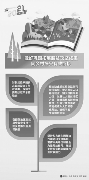 打贏脫貧攻堅戰(zhàn)、全面建成小康社會后,要進一步鞏固拓展脫貧攻堅成果,接續(xù)推動脫貧地區(qū)發(fā)展和鄉(xiāng)村全面振興。為實現(xiàn)鞏固拓展脫貧攻堅成果同鄉(xiāng)村振興有效銜接,。3月22日,新華社對外發(fā)布了《意見》全文。 《意見》明確,脫貧攻堅目標任務完成后,設立5年過渡期。脫貧地區(qū)要根據(jù)形勢變化,理清工作思路,做好過渡期內(nèi)領導體制、工作體系、發(fā)展規(guī)劃、政策舉措、考核機制等有效銜接,從解決建檔立卡貧困人口‘兩不愁三保障’為重點轉向實現(xiàn)鄉(xiāng)村產(chǎn)業(yè)興旺、生態(tài)宜居、鄉(xiāng)風文明、治理有效、生活富裕,從集中資源支持脫貧攻堅轉向鞏固拓展脫貧攻堅成果和全面推進鄉(xiāng)村振興。 政府推動引導 社會市場協(xié)同發(fā)力 《意見》對鞏固拓展脫貧攻堅成果同鄉(xiāng)村振興有效銜接的目標進行了明確。 到2025年,脫貧攻堅成果鞏固拓展,鄉(xiāng)村振興全面推進,脫貧地區(qū)經(jīng)濟活力和發(fā)展后勁明顯增強,鄉(xiāng)村產(chǎn)業(yè)質量效益和競爭力進一步提高,農(nóng)村基礎設施和基本公共服務水平進一步提升,生態(tài)環(huán)境持續(xù)改善,美麗宜居鄉(xiāng)村建設扎實推進,鄉(xiāng)風文明建設取得顯著進展,農(nóng)村基層組織建設不斷加強,農(nóng)村低收入人口分類幫扶長效機制逐步完善,脫貧地區(qū)農(nóng)民收入增速高于全國農(nóng)民平均水平。 到2035年,脫貧地區(qū)經(jīng)濟實力顯著增強,鄉(xiāng)村振興取得重大進展,農(nóng)村低收入人口生活水平顯著提高,城鄉(xiāng)差距進一步縮小,在促進全體人民共同富裕上取得更為明顯的實質性進展。 《意見》強調(diào),要堅持四項主要原則: 要堅持黨的全面領導。堅持中央統(tǒng)籌、省負總責、市縣鄉(xiāng)抓落實的工作機制,充分發(fā)揮各級黨委總攬全局、協(xié)調(diào)各方的領導作用,省市縣鄉(xiāng)村五級書記抓鞏固拓展脫貧攻堅成果和鄉(xiāng)村振興??偨Y脫貧攻堅經(jīng)驗,發(fā)揮脫貧攻堅體制機制作用。 堅持有序調(diào)整、平穩(wěn)過渡。過渡期內(nèi)在鞏固拓展脫貧攻堅成果上下更大功夫、想更多辦法、給予更多后續(xù)幫扶支持,對脫貧縣、脫貧村、脫貧人口扶上馬送一程,確保脫貧群眾不返貧。在主要幫扶政策保持總體穩(wěn)定的基礎上,分類優(yōu)化調(diào)整,合理把握調(diào)整節(jié)奏、力度和時限,增強脫貧穩(wěn)定性。 堅持群眾主體、激發(fā)內(nèi)生動力。堅持扶志扶智相結合,防止政策養(yǎng)懶漢和泛福利化傾向,發(fā)揮奮進致富典型示范引領作用,激勵有勞動能力的低收入人口勤勞致富。 堅持政府推動引導、社會市場協(xié)同發(fā)力。堅持行政推動與市場機制有機結合,發(fā)揮集中力量辦大事的優(yōu)勢,廣泛動員社會力量參與,形成鞏固拓展脫貧攻堅成果、全面推進鄉(xiāng)村振興的強大合力。 聚力做好四項重點工作 《意見》要求聚力做好脫貧地區(qū)鞏固拓展脫貧攻堅成果同鄉(xiāng)村振興有效銜接重點工作。 一是支持脫貧地區(qū)鄉(xiāng)村特色產(chǎn)業(yè)發(fā)展壯大。注重產(chǎn)業(yè)后續(xù)長期培育,尊重市場規(guī)律和產(chǎn)業(yè)發(fā)展規(guī)律,提高產(chǎn)業(yè)市場競爭力和抗風險能力。以脫貧縣為單位規(guī)劃發(fā)展鄉(xiāng)村特色產(chǎn)業(yè),實施特色種養(yǎng)業(yè)提升行動,完善全產(chǎn)業(yè)鏈支持措施。加快脫貧地區(qū)農(nóng)產(chǎn)品和食品倉儲保鮮、冷鏈物流設施建設,支持農(nóng)產(chǎn)品流通企業(yè)、電商、批發(fā)市場與區(qū)域特色產(chǎn)業(yè)精準對接?,F(xiàn)代農(nóng)業(yè)產(chǎn)業(yè)園、科技園、產(chǎn)業(yè)融合發(fā)展示范園繼續(xù)優(yōu)先支持脫貧縣。支持脫貧地區(qū)培育綠色食品、有機農(nóng)產(chǎn)品、地理標志農(nóng)產(chǎn)品,打造區(qū)域公用品牌。繼續(xù)大力實施消費幫扶。 二是促進脫貧人口穩(wěn)定就業(yè)。搭建用工信息平臺,培育區(qū)域勞務品牌,加大脫貧人口有組織勞務輸出力度。支持脫貧地區(qū)在農(nóng)村人居環(huán)境、小型水利、鄉(xiāng)村道路、農(nóng)田整治、水土保持、產(chǎn)業(yè)園區(qū)、林業(yè)草原基礎設施等涉農(nóng)項目建設和管護時廣泛采取以工代賑方式。延續(xù)支持扶貧車間的優(yōu)惠政策。過渡期內(nèi)逐步調(diào)整優(yōu)化生態(tài)護林員政策。統(tǒng)籌用好鄉(xiāng)村公益崗位,健全按需設崗、以崗聘任、在崗領補、有序退崗的管理機制,過渡期內(nèi)逐步調(diào)整優(yōu)化公益崗位政策。 三是持續(xù)改善脫貧地區(qū)基礎設施條件。繼續(xù)加大對脫貧地區(qū)基礎設施建設的支持力度,重點謀劃建設一批高速公路、客貨共線鐵路、水利、電力、機場、通信網(wǎng)絡等區(qū)域性和跨區(qū)域重大基礎設施建設工程。按照實施鄉(xiāng)村建設行動統(tǒng)一部署,支持脫貧地區(qū)因地制宜推進農(nóng)村廁所革命、生活垃圾和污水治理、村容村貌提升。推進脫貧縣“四好農(nóng)村路”建設,推動交通項目更多向進村入戶傾斜,因地制宜推進較大人口規(guī)模自然村(組)通硬化路,加強通村公路和村內(nèi)主干道連接,加大農(nóng)村產(chǎn)業(yè)路、旅游路建設力度。加強脫貧地區(qū)農(n
