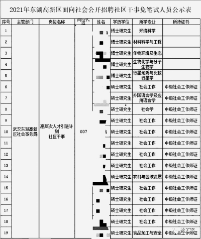 9月9日,武漢東湖高新區(qū)面向社會公開招聘社區(qū)干事免筆試人員公示表中,有5名博士在名單中。 在這份東湖高新區(qū)面向社會公開招聘社區(qū)干事免筆試人員公示表中,共有19名碩士研究生以上學歷人員,其中5名博士研究生,專業(yè)各不一樣,分別是:環(huán)境科學、材料科學與工程、作物環(huán)境及生態(tài)、生物化學與分子生物學、行星地質與比較行星學。 公告中說,對博士研究生或持有中級及以上社工證的碩士研究生,可向東湖高新區(qū)社會事務局申請免筆試。這意味著,現(xiàn)在通過申請免筆試的19名碩士研究生及以上學歷人員,將競爭4個社區(qū)干事崗位。 此公示表一出爐就立即引發(fā)了網(wǎng)友的熱議!相關話題也沖上了熱搜。 在這5位博士研究生中,除了生化環(huán)材專業(yè)的博士,這位所學專業(yè)是‘行星地質與比較行星學’的博士引起了大家的注意,‘行星地質學女博士報考社區(qū)干事’的話題也沖上熱搜。 怎么看都覺得這個專業(yè)和社區(qū)工作毫無關聯(lián)。 專業(yè)不對口,大材小用? 對于熱議,當事人“行星地質學”博士研究生胡曉依也做出了回應。 針對網(wǎng)友熱議,胡曉依回復:并不是專業(yè)不好就業(yè),也并非大材小用。 胡曉依表示,如果我有幸在社區(qū)工作,不存在大材小用的問題,一樣可以在基層有所作為。我就是既要仰望星空,也要腳踏實地。 胡曉依說:工作不分大小,我是想做自己比較喜歡的工作,想鍛煉下自己。選擇報考社區(qū)干事,絕對不是說我們專業(yè)不好就業(yè)。我們行星地質研究前景很大,對宇宙的探索可是永無止境的呢。我的很多同學、師兄師姐都做得很好。 我只是想看看自己有沒有別的潛能,磨礪下自己。未來,不管在哪個崗位工作,我會一直關注我們的行星地質研究專業(yè)。 通過本碩博學習,培養(yǎng)了我三個方面的能力:動手能力還可以;行星地質研究要處理一些數(shù)據(jù),養(yǎng)成了細心、耐心習慣;從發(fā)現(xiàn)問題到尋找答案,有最終解決問題的辦法。這三方面的能力,在社區(qū)工作中應該有廣闊的發(fā)揮空間。如果我有幸在社區(qū)工作,不存在大材小用的問題,一樣可以在基層有所作為。 這么多博士、碩士研究生去競聘社區(qū)干事,有壓力嗎?胡曉依表示,報考社區(qū)干事,雖然免了筆試,但還要參加面試,我不一定考得上。如果沒考上,我也不會后悔,畢竟努力了。 博士入基層,不是個例 其實,博士去基層社區(qū)工作,也并不是個例。 今年年初,41歲的武漢人童文平已經(jīng)在杭州慶豐社區(qū)干了快兩年的社工。之前,他在武漢大學碩博連讀6年,在上海、杭州科研機構工作一段時間后,又回武漢大學做了6年的博士后研究。 據(jù)悉,他學的是生命科學專業(yè),29歲博士畢業(yè),2011年在杭州做助理研究員時接觸到基因測序相關課題,越做越興奮,于是進入武大一個國家重點實驗室做博士后研究,“我感覺自己在挖礦,一個富礦,越挖越想繼續(xù),一呆就是六年”。 隨后課題結束,童文平來到杭州,向西湖大學投了簡歷,但沒下文。在轉黨組織關系時,他碰到西湖區(qū)在招社工,“科研這條路,該嘗試的我都嘗試了,高校、科研機構都呆過,感興趣的課題也盡全力探索過。我想是不是可以換條跑道,就去應聘了。” 現(xiàn)在的童文平,為靈隱街道慶豐社區(qū)社工,具體負責就業(yè)管理,還是社區(qū)網(wǎng)格員。“第一個月雖然拿到手3800元錢,但我很喜歡和居民打交道,這工作挺好,后面工資也提上來了?!蓖钠斤@得挺滿足。 還有,深圳南山區(qū)街道辦事處副主任羅林姣是美國哈佛大學博士后。2013年成為該系腦科學中心博士后,同年回國在南京大學物理學院任副教授;但2018年,她選擇離開高校出任桃源街道辦副主任。 不得不說,這樣的內卷是我高攀不上的。 進入社區(qū)后的博士們 在社區(qū)工作的博士是怎樣的呢?大材小用了嗎?是不是做了就辭職?來看看他們的故事。 1.他是博士,他來社區(qū),領導社區(qū) 張巍,華中師范大學生物學博士,已在湖北省武漢經(jīng)濟技術開發(fā)區(qū)軍山街龍湖社區(qū)工作了7年,從社區(qū)專干起步,現(xiàn)為社區(qū)副書記、副主任。 入職社區(qū)之初,街道領導給張巍布置了一個任務,寫一份材料談談社區(qū)工作應該怎么做。張巍花了一周時間,大量查閱文獻資料,最后寫了3000字的調研分析報告,這份報告后來被街道當作學習材料。 善于學習的張巍每天堅持利用空閑時間學習,將收集到的好的方法、案例記錄在筆記本上,并附上自己的心得。記者看到,幾年下來,他積攢了兩大本筆記。 在同事眼里,張巍工作中每次都能耐心聽各方講完,再逐條分析解釋,做到以理服人,“從不發(fā)脾氣”。 在社區(qū)書記劉凱眼里,張巍學識淵博、思路開闊,是自己的“智囊”,同時也有非常強的行動力。張巍則認為,自己能在工作上取得突破,以前從事科學研究時養(yǎng)成的習慣非常重要。 2.他是博士后,他來社區(qū),服務社區(qū) 42歲的童文平,是浙江省杭州市西湖區(qū)靈隱街道慶豐社區(qū)的一名普通社工,負責就業(yè)管理工作。 2008年,他在武漢大學拿到了博士學位,主修生命科學學院生物化學與分子生物學專業(yè)。2011年到2017年,是武漢大學的某重點實驗室博士后。2018年12月,童文平考進西湖區(qū)靈隱街道慶豐社區(qū),做了一名