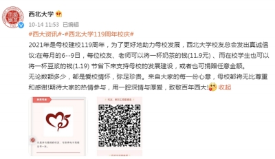 近日,西北大學(xué)官方微博發(fā)出的一則募捐倡議引發(fā)網(wǎng)友熱議。 今年,西北大學(xué)迎來(lái)建校119周年。該校校友總會(huì)號(hào)召校友、老師及學(xué)生,每月捐出一杯奶茶或一杯豆?jié){的錢,支持母校發(fā)展。 倡議發(fā)出后,引來(lái)網(wǎng)友調(diào)侃西北大學(xué)是“中國(guó)最窮211”。 10月18日,西北大學(xué)工作人員回應(yīng)稱,校友捐贈(zèng)是大學(xué)經(jīng)費(fèi)的來(lái)源之一,很多大學(xué)都有這種渠道?!拔覀兪窃诜煽蚣芟逻M(jìn)行的,錢款的使用都會(huì)公示?!?/p> 募捐“一杯奶茶的錢” 10月14日,西北大學(xué)官方微博發(fā)布一則捐贈(zèng)倡議。該校校友總會(huì)對(duì)校友、老師及在校學(xué)生發(fā)出號(hào)召:在每月的6~9日將一杯奶茶(11.9元)或一杯豆?jié){(1.19元)的錢節(jié)省下來(lái)支持母校發(fā)展建設(shè),或者也可捐贈(zèng)任意金額,并在文字下方配有捐贈(zèng)二維碼圖片。 倡議發(fā)出后,引來(lái)不少圍觀。對(duì)此,有網(wǎng)友表示“大為震驚”,并寫道“不是說(shuō)缺一杯奶茶錢豆?jié){錢……倡議捐錢是長(zhǎng)久之計(jì)嗎”。也有人認(rèn)為,“雖然我也捐了,希望學(xué)校也越來(lái)越好,但是我覺(jué)得這個(gè)行為多多少少有點(diǎn)……” 其中也不乏網(wǎng)友調(diào)侃,“捐了,不要讓我沒(méi)學(xué)上”“俺們是真的樸”“中國(guó)最窮211,心酸,淚目”。 多的留言則是為西北大學(xué)“哭窮”:“在校到畢業(yè),感覺(jué)西大一直挺大方。這次雖說(shuō)是倡議,但這樣伸手,看來(lái)真的缺錢了吧,救救西大”“太慘了太慘了……” 撞名美國(guó)著名的西北大學(xué),我國(guó)西北大學(xué)盡管實(shí)力不凡,卻顯得“不太知名”。實(shí)際上,擁有119年歷史的西北大學(xué)是我國(guó)西北地區(qū)辦學(xué)歷史最為悠久的高等學(xué)府。 官方簡(jiǎn)介顯示,西北大學(xué)現(xiàn)為首批國(guó)家“世界一流學(xué)科建設(shè)高?!?、國(guó)家“211工程”建設(shè)院校、教育部與陜西省共建高校。 在2017年的第四輪學(xué)科評(píng)估中,該校有2個(gè)學(xué)科進(jìn)入A類,16個(gè)學(xué)科進(jìn)入前30%,學(xué)科整體實(shí)力和水平較第三輪學(xué)科評(píng)估有了較大提升。地球科學(xué)、材料科學(xué)、化學(xué)、工程學(xué)、臨床醫(yī)學(xué)、藥理學(xué)與毒理學(xué)等學(xué)科還進(jìn)入ESI全球前1%行列。 中國(guó)“最窮”211? 由校友總會(huì)發(fā)起的一項(xiàng)募捐活動(dòng)也許不代表西北大學(xué)校方試圖以這種方式獲得“大力支持”。但這并不妨礙網(wǎng)友們“借題發(fā)揮”,為西北大學(xué)“實(shí)慘”的經(jīng)費(fèi)現(xiàn)狀而賣力“哭窮”。 當(dāng)前,陜西省共有8所“雙一流”高校,其中3所“一流大學(xué)建設(shè)高?!保次靼步煌ù髮W(xué)、西北工業(yè)大學(xué)、西北農(nóng)林科技大學(xué);5所“一流學(xué)科建設(shè)高?!保次鞅贝髮W(xué)、西安電子科技大學(xué)、長(zhǎng)安大學(xué)、陜西師范大學(xué)、第四軍醫(yī)大學(xué)。 西北大學(xué)則是8所中唯一一所省屬高校,這成為影響其經(jīng)費(fèi)來(lái)源的重要因素。 同在陜西的教育部直屬高校西交大、工信部直屬高校西工大的2021年經(jīng)費(fèi)預(yù)算已躋身百億。其他4所陜西部屬“雙一流”——西電、西農(nóng)、長(zhǎng)大、陜師大的預(yù)算總經(jīng)費(fèi)分別為51.78億元、45.55億元、35.71億元、31.87億元。 作為陜西省屬高校,西北大學(xué)的預(yù)算經(jīng)費(fèi)為14.18億元,和上面幾所高校相去甚遠(yuǎn)。而這一數(shù)字已相較去年增加了5.73億,增長(zhǎng)百分比高達(dá)67.8%。 在東西部之間、西部區(qū)域省份內(nèi)的高校經(jīng)費(fèi)差距更加明顯。 2021年,同樣位于西部的四川省10所地方高校預(yù)算收入均超過(guò)10億元。再以省屬頭部高校為例,蘇州大學(xué)預(yù)算收入32.84億元,成都大學(xué)為24.3億元。 經(jīng)費(fèi)捉襟見(jiàn)肘,西北大學(xué)產(chǎn)出卻不低。 據(jù)西北大學(xué)校長(zhǎng)郭立宏透露,該校投入產(chǎn)出比位居全國(guó)高校前列。西北大學(xué)辦學(xué)經(jīng)費(fèi)投入位列95所一流學(xué)科建設(shè)高校中下游,高層次人才引育成效和科研產(chǎn)出則分列第8和第24位。 西北大學(xué)官微在一篇題為《西北大學(xué)2020年十大新聞》的文章披露,2020年,該校獲批國(guó)家級(jí)哲學(xué)社會(huì)科學(xué)科研項(xiàng)目41項(xiàng),其中重大重點(diǎn)項(xiàng)目8項(xiàng);教育部人文社科項(xiàng)目20項(xiàng);獲批國(guó)家自然科學(xué)基金135項(xiàng),其中重大重點(diǎn)項(xiàng)目6項(xiàng),獲批國(guó)家重點(diǎn)研發(fā)計(jì)劃課題8項(xiàng);科研到款經(jīng)費(fèi)3.58億元,其中理工類縱向項(xiàng)目到款2.26億元,創(chuàng)歷史新高。 2021年8月,西北大學(xué)公布2021年度國(guó)家自然科學(xué)基金項(xiàng)目申請(qǐng)結(jié)果。在申報(bào)的各類項(xiàng)目579項(xiàng),共有144項(xiàng)項(xiàng)目獲得資助,獲批直接經(jīng)費(fèi)6944萬(wàn)元,項(xiàng)目資助率24.87%,超過(guò)基金委平均資助率8個(gè)百分點(diǎn)。獲批項(xiàng)目數(shù)較上年同期增長(zhǎng)9.92%。 高校校友“高額”捐贈(zèng) 那么,西北大學(xué)