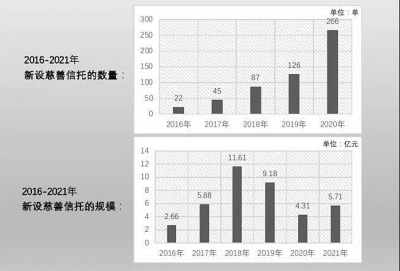 ■ 本報(bào)記者 王勇 1月18日,中國(guó)慈善聯(lián)合會(huì)與中國(guó)信托業(yè)協(xié)會(huì)聯(lián)合發(fā)布《2021年中國(guó)慈善信托發(fā)展報(bào)告》(以下簡(jiǎn)稱《報(bào)告》)。 《報(bào)告》顯示,截至2021年年底,全國(guó)累計(jì)慈善信托備案773單,財(cái)產(chǎn)規(guī)模達(dá)39.35億元。其中2021年新設(shè)立慈善信托共計(jì)227單,財(cái)產(chǎn)規(guī)模達(dá)5.71億元,較上年增加32.48%。《報(bào)告》顯示,2021年慈善信托的發(fā)展呈現(xiàn)八項(xiàng)特征。 《報(bào)告》還列出了備案慈善信托最多的省份、備案財(cái)產(chǎn)規(guī)模最大的省份、備案數(shù)量最多的信托公司、備案規(guī)模最大的信托公司、受托管理慈善信托最多的慈善組織、托管數(shù)量最多的銀行、托管規(guī)模最大的銀行、監(jiān)察慈善信托數(shù)量最多的監(jiān)察人等信息。 中國(guó)慈善聯(lián)合會(huì)副會(huì)長(zhǎng)劉忠祥表示,促進(jìn)慈善信托的發(fā)展,需要進(jìn)一步加大宣傳推廣力度;加快出臺(tái)相關(guān)配套制度;建立寬嚴(yán)適度的慈善信托備案制度。此外,行業(yè)自律也是促進(jìn)慈善信托發(fā)展的重要力量。 慈善信托發(fā)展呈現(xiàn)八大特點(diǎn) 《報(bào)告》對(duì)2021年慈善信托發(fā)展情況進(jìn)行了總結(jié),認(rèn)為慈善信托的發(fā)展呈現(xiàn)八項(xiàng)特點(diǎn)。 一是慈善信托發(fā)展平穩(wěn)增長(zhǎng),具體表現(xiàn)為: (一)新設(shè)慈善信托227單,較2020年的266單有所下降;但財(cái)產(chǎn)規(guī)模達(dá)到5.71億元,與2020年4.31億元相比,止跌回升。 (二)單筆慈善信托規(guī)模較小。其中十萬(wàn)元級(jí)的慈善信托115單,占全年新設(shè)慈善信托的50.7%;百萬(wàn)元級(jí)的慈善信托56單,占比24.7%。這一比例與往年接近,十萬(wàn)元級(jí)和百萬(wàn)元級(jí)規(guī)模在我國(guó)慈善信托中仍是主流。 (三)慈善信托財(cái)產(chǎn)在持續(xù)增加。2021年,共有29單慈善信托進(jìn)行了信托財(cái)產(chǎn)的追加,延續(xù)上升趨勢(shì),追加規(guī)模合計(jì)7546.35萬(wàn)元。 二是慈善信托涉及地域不斷擴(kuò)大,但地區(qū)之間發(fā)展不均衡的狀況仍然比較明顯。 2021年,全國(guó)共有19個(gè)省、直轄市、自治區(qū)備案慈善信托。其中,浙江省78單、甘肅省22單。 按照2016年至2021年累計(jì)計(jì)算,僅浙江、甘肅兩省備案慈善信托超過(guò)100單;廣東、陜西、北京三地超過(guò)50單;而湖北、黑龍江、湖南、新疆、遼寧、吉林、云南、內(nèi)蒙古、貴州、山西、河北、海南12個(gè)省份則不到10單。 三是委托人參與慈善信托意愿上升,具體表現(xiàn)為: (一)同一委托人設(shè)立多單慈善信托。2021年有多位委托人在已經(jīng)設(shè)立過(guò)一單或多單慈善信托的情況下,再次設(shè)立慈善信托,其中包括4名自然人、11家企業(yè)(其中4家為集合發(fā)起)、5家基金會(huì)、8家地方慈善總會(huì)和1家慈善協(xié)會(huì)。 (二)同一慈善信托在追加財(cái)產(chǎn)過(guò)程中增加委托人。2021年有多單慈善信托在往年已設(shè)立的情況下通過(guò)備案變更,增加一位或多位委托人,增加慈善信托財(cái)產(chǎn)。其中包括6家企業(yè)、15家地方慈善總會(huì)和8家基金會(huì)。 (三)社會(huì)組織委托設(shè)立數(shù)量居首。2021年,以社會(huì)組織為委托人的慈善信托有88單,備案規(guī)模為13637.67萬(wàn)元。無(wú)論是新增數(shù)量還是規(guī)模均已明顯超越企業(yè)委托情形。 四是慈善信托受托人持續(xù)發(fā)力,具體表現(xiàn)為: (一)受托人集中度仍然較高。2021年備案慈善信托數(shù)量最多的是萬(wàn)向信托,備案62單;其次是光大信托,備案23單。 (二)信托公司仍為受托機(jī)構(gòu)中的主力軍,2021年由信托公司擔(dān)任單一受托人的慈善信托達(dá)到173單;與此同時(shí),雙受托比例大幅增長(zhǎng),在2021年達(dá)到49單,遠(yuǎn)超2020年的11單。 “目前,慈善信托成為中國(guó)信托業(yè)參與社會(huì)公益慈善事業(yè)的主要方式,也成為社會(huì)各界參與慈善事業(yè)的重要載體之一。”中國(guó)信托業(yè)協(xié)會(huì)副秘書(shū)長(zhǎng)鄭方強(qiáng)調(diào)。 (三)慈善組織開(kāi)始發(fā)力慈善信托。46家基金會(huì)、慈善會(huì)或慈善總會(huì)首次作為慈善信托的受托人,其中浙江省杭州市基金會(huì)新增受托設(shè)立的慈善信托最多,共10單。 五是慈善信托期限趨于靈活。 2021年備案的慈善信托中有99單是無(wú)固定期限的,比2016年至2020年備案的所有無(wú)固定期限慈善信托還多。 六是信托目的呈多樣化趨勢(shì)。 從信托目的來(lái)看,2021年備案的慈善信托涵蓋了慈善法規(guī)定的慈善活動(dòng)所有領(lǐng)域,同時(shí)關(guān)注鄉(xiāng)村振興、體育、環(huán)保的比例上升。 2021年鄉(xiāng)村振興慈善信托共有33單,規(guī)模8176.17萬(wàn)元。包括中航信托、光大信托、中誠(chéng)信托、長(zhǎng)安信托、萬(wàn)向信托、五礦信托、金谷信托、華融信托、粵財(cái)信托等23家信托公司及桐廬縣慈善總會(huì)、天津市福老基金會(huì)(共同受托人)受托成立了鄉(xiāng)村振興慈善信托。 七是銀行托管穩(wěn)固發(fā)展。 截至2021年年底,擔(dān)任過(guò)慈善信托的托管銀行數(shù)為32家,其中新增1家。32