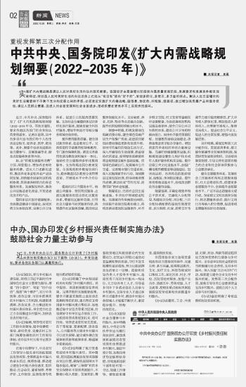 中共中央、國務(wù)院印發(fā)《擴(kuò)大內(nèi)需戰(zhàn)略規(guī)劃綱要(2022-2035年)》