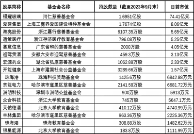 中科創(chuàng)達3月13日晚披露,公司控股股東趙鴻飛擬向北京理工大學教育基金會(以下簡稱“北理工教育基金會”)捐贈其間接持有的公司16.9萬股股份。以中科創(chuàng)達當前股價估算,上述捐贈的股份市值約1041.38萬元。如此大手筆的捐贈也引發(fā)了市場熱議。 作為在民政部正式登記注冊的慈善組織,北理工教育基金會承諾其受贈資金都將用于北京理工大學的教育發(fā)展及社會公益事業(yè)。 記者根據(jù)A股上市公司過往定期報告梳理發(fā)現(xiàn),目前有十幾家基金會活躍其中。截至目前,這些基金會合計持股市值已超百億元,其持股主要來自于上市公司股東捐贈。 截至2023年9月30日,河仁慈善基金會持有福耀玻璃股票1.7億股;截至今年3月13日收盤,上述股份市值高達74.41億元。 河仁基金會由企業(yè)家、福耀玻璃董事長曹德旺捐資創(chuàng)立,是全國第一也是唯一經(jīng)由國務(wù)院審批、以金融資產(chǎn)(股票)創(chuàng)辦的全國性非公募基金會?;饡拿Q,來自曹德旺的父親曹河仁,名稱中蘊藏“上善若水,厚德載物”之意。 2011年5月,在河仁基金會成立大會上,曹德旺與其妻子陳鳳英宣布向基金會捐贈個人所持福耀玻璃3億股股票。上述股票過戶當日市值為35.49億元。 2012年度,河仁基金會減持福耀玻璃股票1000萬股,期末持股2.9億股。在此后的多年時間里,河仁基金會所持福耀玻璃股票一直未發(fā)生變化。2020年度,河仁基金會減持福耀玻璃股票6891.09萬股,期末持股2.21億股。2021年、2022年河仁基金會分別減持3180.02萬股、1977.6萬股,持股降至1.7億股。 曹德旺一直熱衷慈善。據(jù)公開信息,從1983年第一次捐款至今,曹德旺累計個人捐款達160億元。 持股市值排名第二的慈善基金會為上海工商界愛國建設(shè)特種基金會(以下簡稱“愛建基金會”)。愛建基金會持有愛建集團股票1.77億股,市值約8.06億元。 據(jù)愛建基金會網(wǎng)站介紹,其前身是上海工商界愛國建設(shè)特種基金(以下簡稱“愛建特種基金會”)。上世紀80年代末至90年代初,愛建集團前身愛國建設(shè)醞釀股份制改革,把歷年積累的4500萬元捐贈出來,設(shè)立了愛國建設(shè)特種基金。1992年9月,愛國建設(shè)改制為股份公司,愛建特種基金會成為發(fā)起人股東。2005年4月,愛建特種基金會更名為愛建基金會。 愛建集團上市后,愛建基金會長期為公司控股股東。2012年6月,愛建集團完成非公開發(fā)行,愛建基金會持股比例遭稀釋。上市公司在2012年年報中稱自己無控股股東。 2018年6月,愛建集團非公開發(fā)行股票完成及董事會調(diào)整后,均瑤集團成為上市公司控股股東。愛建基金會退居次席,為公司第二大股東。 持股市值排名第三的為浙江嘉行慈善基金會(以下簡稱“嘉行基金會”)。截至去年9月末,嘉行基金會持有海亮股份股票6107.35萬股。這筆股權(quán)目前市值約5.65億元。 嘉行基金會成立于2007年8月。其網(wǎng)站稱,基金規(guī)模為11.86億元,全部來源于海亮集團(海亮股份控股股東)及創(chuàng)始人馮海良和公司其他股東捐贈。截至2023年年底,嘉行基金會累計捐贈總額超過21.47億元。 截至去年9月末,浙江存濟醫(yī)療教育基金會(以下簡稱“存濟基金會”)持有通策醫(yī)療股票796.08萬股。這筆股權(quán)目前市值5.25億元。 據(jù)相關(guān)報道,2015年7月,通策醫(yī)療牽頭發(fā)起成立存濟基金會。公司實際控制人呂建明曾表示,其希望基金會在未來能夠為中國現(xiàn)代醫(yī)學的長期發(fā)展奠定系統(tǒng)的、堅實的、高水平的基礎(chǔ),推動醫(yī)學基礎(chǔ)研究,引進世界先進醫(yī)療技術(shù),提高醫(yī)療教育水平等。 2019年12月,通策醫(yī)療披露,其股東鮑正梁向存濟基金會捐贈961.92萬股公司股票,用于符合基金會資助標準的醫(yī)療教育項目。 自2022年第四季度起,存濟基金會陸續(xù)減持了所持通策醫(yī)療部分股票。至2023年6月末,存濟基金會持股降至796.08萬股。 美的集團創(chuàng)始人何享健發(fā)起設(shè)立的廣東省和的慈善基金會(以下簡稱“和的基金會”)持有賽意信息股票2000萬股。截至目前,和的基金會上述持股市值約4.05億元,排名第五。截至2022年12月,和的基金會對外資助金額近22億元,主要用于資助醫(yī)養(yǎng)健康、文化藝術(shù)、社區(qū)發(fā)展等項目。 一些基金會獲贈的大額股份尚未完成過戶。 概倫電子2023年7月曾披露,為支持母校華南理工大學的教育事業(yè)的發(fā)展,促進學校集成電路學科的建設(shè)與發(fā)展,公司董事長劉志宏將向廣東省華南理工大學教育發(fā)展基金會捐贈其間接持有的178萬股公司股份。按照概倫電子當時的市值計算,其捐贈總價值超過4700萬元。這筆股權(quán)需在2025年6月28日之后滿足解除限售條件。在解除限售之前,捐贈各方不會辦理股份的交割手續(xù)。 去年10月,華熙生物公告稱,公司實際控制人趙燕擬將其間接持有的481.68萬股公司股份(約占公司總股本的1%)捐贈給山東大學教育基金會。由于上述股份尚處于鎖定期(2019年11月6日至2024年11月5日),捐贈雙方協(xié)商確定,標的股票在鎖定期屆滿后根據(jù)相關(guān)規(guī)定一次性辦理完成交割手續(xù)。 趙燕表示,中國的透明質(zhì)酸產(chǎn)業(yè)和華熙生物的發(fā)展受益于張?zhí)烀窠淌诩捌鋵W生在透明質(zhì)酸技術(shù)的創(chuàng)新。她捐贈上述股份是為紀念張?