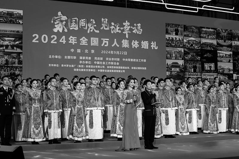 9月22日,由全國婦聯(lián)、國家民委、民政部、農(nóng)業(yè)農(nóng)村部、中央軍委政治工作部聯(lián)合主辦,中國社會(huì)工作聯(lián)合會(huì)承辦的“家國同慶 見證幸?!?024年全國萬人集體婚禮,在北京主會(huì)場(chǎng)、各省(自治區(qū)、直轄市)和新疆生產(chǎn)建設(shè)兵團(tuán)49個(gè)分會(huì)場(chǎng)同步進(jìn)行。來自全國各省區(qū)市和港澳臺(tái)地區(qū)的5105對(duì)新人參與這場(chǎng)中式集體婚禮,在同一時(shí)刻許下幸福誓言,喜迎新中國75周年華誕。全國婦聯(lián)黨組書記、副主席、書記處第一書記黃曉薇為新人證婚。民政部黨組書記、部長陸治原為新人主婚。 儀式上,通過視頻連線,主分會(huì)場(chǎng)的萬名新人完成婚禮儀式,共同許下風(fēng)雨同行、相知相守、家風(fēng)潤心、向上向善、修身立業(yè)、胸懷家國的幸福誓言。全國道德模范、全國文明家庭等先進(jìn)典型代表和金婚伉儷代表等為新人們送上美好祝福。新人代表發(fā)出了爭做中華家庭美德的傳承者、新型婚育文化的引領(lǐng)者、社會(huì)主義家庭文明新風(fēng)尚的踐行者倡議。 各會(huì)場(chǎng)精彩紛呈,廣東廣州設(shè)置婚俗文化展,把代表廣府婚俗歷史文化變遷的喜文化納入展陳,展示婚俗禮儀;福建福州邀請(qǐng)6對(duì)臺(tái)胞新人參加,成為深化兩岸情感融合的有力印證;重慶將婚禮向婚戀延展,現(xiàn)場(chǎng)邀請(qǐng)未婚青年觀禮;陜西西安新人們身著唐制婚服,穿過六國元首共植的友誼樹,在中國-中亞峰會(huì)的主會(huì)場(chǎng)許下相守誓言……各地紛紛將優(yōu)秀傳統(tǒng)文化、移風(fēng)易俗等家庭文明建設(shè)內(nèi)容融入集體婚禮環(huán)節(jié),以中式婚禮弘揚(yáng)婚事新辦簡辦新風(fēng)貌。 新人們來自28個(gè)民族,遍及科技、教育、文化、醫(yī)療、農(nóng)業(yè)等各行各業(yè)。在各分會(huì)場(chǎng),婦聯(lián)組織聯(lián)合有關(guān)部門將傳統(tǒng)文化、移風(fēng)易俗等家庭文明建設(shè)內(nèi)容融入集體婚禮相關(guān)環(huán)節(jié),傳承民族婚俗禮儀文化,弘揚(yáng)婚事新辦的文明新風(fēng)。 民政部相關(guān)負(fù)責(zé)人表示,以“家國同慶 見證幸?!睘橹黝}舉辦集體婚禮,是對(duì)祖國最深情的告白,更是厚植家國情懷的生動(dòng)體現(xiàn)。這場(chǎng)萬人集體婚禮將在倡導(dǎo)移風(fēng)易俗、婚事新辦簡辦,反對(duì)高額彩禮、大操大辦,進(jìn)一步倡導(dǎo)新型婚育文化,培育社會(huì)主義家庭文明新風(fēng)尚等方面起到積極作用。 (據(jù)中國社會(huì)工作聯(lián)合會(huì)) |