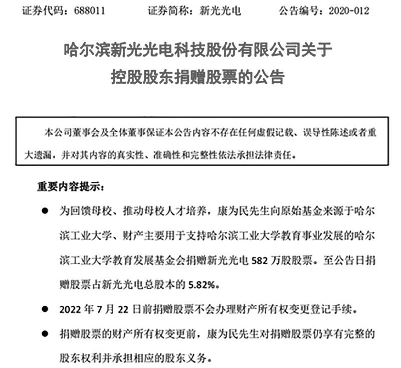 近年來股權(quán)捐贈已成為企業(yè)家/企業(yè)支持慈善事業(yè)的共同選擇和未來趨勢。而由于經(jīng)濟波動等不確定性影響因素增多,有關(guān)捐贈承諾兌現(xiàn)和落地執(zhí)行情況也備受社會關(guān)注,由此引發(fā)的爭議一直未斷。 ■ 本報記者 皮磊 據(jù)多家媒體報道,哈爾濱新光光電科技股份有限公司(簡稱“新光光電”)日前發(fā)布公告稱,公司近日收到嵩縣監(jiān)察委員會簽發(fā)的關(guān)于對公司控股股東、實際控制人、董事長、總經(jīng)理康為民的《立案通知書》和《留置通知書》,康為民被實施留置措施。 針對上述情況,有媒體致電新光光電證券部嘗試了解更多細節(jié)。該公司工作人員回應(yīng)稱,“目前尚未獲得更多確切消息?!惫ぷ魅藛T表示,公司內(nèi)控完善,已召開臨時董事會落實工作安排,主營業(yè)務(wù)與產(chǎn)品方向未變。 作為一家軍工電子信息企業(yè),該消息一經(jīng)發(fā)布即引發(fā)外界猜測。不過,在關(guān)注事件進展的同時,有關(guān)康為民曾向其母校哈爾濱工業(yè)大學(xué)捐贈582萬股股票一事被翻出,甚至對該筆捐贈的程序和動機提出質(zhì)疑。事實上,近年來股權(quán)捐贈已成為企業(yè)家/企業(yè)支持慈善事業(yè)的共同選擇和未來趨勢。而由于經(jīng)濟波動等不確定性影響因素增多,有關(guān)捐贈承諾兌現(xiàn)和落地執(zhí)行情況也備受社會關(guān)注,由此引發(fā)的爭議一直未斷。 582萬股股權(quán)捐贈始末 據(jù)新光光電官網(wǎng)介紹,新光光電成立于2007年11月,注冊資本1億元,是東北地區(qū)科創(chuàng)板上市公司。該公司是一家將像方掃描成像制導(dǎo)技術(shù)、多光學(xué)波段合成技術(shù)等先進光電技術(shù)應(yīng)用于光學(xué)制導(dǎo)類武器研制的企業(yè),致力于服務(wù)國防科技工業(yè)先進武器系統(tǒng)研制等領(lǐng)域。公開資料顯示,康為民父子都是哈工大人,康為民本科和碩士都在哈工大就讀,隨后又在哈工大工作20多年,直到創(chuàng)辦上市公司。 2020年6月2日,新光光電發(fā)布關(guān)于控股股東捐贈股票的公告。公告稱,公司于2020年6月1日接到控股股東康為民通知,其與哈爾濱工業(yè)大學(xué)教育發(fā)展基金會簽署了《捐贈協(xié)議書》。根據(jù)公告,為回饋母校、推動母校人才培養(yǎng),康為民向哈爾濱工業(yè)大學(xué)教育發(fā)展基金會捐贈新光光電582萬股股票。至公告日,捐贈股票占新光光電總股本的5.82%。按照當(dāng)時股價計算,這批股票價值高達2.4億元。 按照捐贈協(xié)議,該筆捐贈用于設(shè)立“松高·卓越工程師獎助學(xué)金”、設(shè)立“松高·優(yōu)秀中青年教師貢獻獎”、設(shè)立“松高·優(yōu)秀科技成果獎”、設(shè)立“新興產(chǎn)業(yè)與技術(shù)發(fā)展創(chuàng)新基金”等。 2024年11月4日,新光光電發(fā)布關(guān)于控股股東捐贈股份完成過戶暨股東權(quán)益變動的提示性公告。公告稱,公司于2024年11月4日收到康為民通知,康為民與基金會的非交易過戶已經(jīng)在中國證券登記結(jié)算有限公司上海分公司完成過戶登記手續(xù),并出具了《證券過戶登記確認書》。 公告顯示,本次股份捐贈過戶登記完成后,康為民及其一致行動人持有公司股份52348457股,占公司總股本的52.35%,仍為公司控股股東。本次股份捐贈過戶登記完成后,哈爾濱工業(yè)大學(xué)教育發(fā)展基金會持有公司無限售流通股582萬股,占當(dāng)時公司總股本的5.82%。 該公告還特別指出,本次股份捐贈未違反《上市公司收購管理辦法》《上市公司股東、董監(jiān)高減持股份的若干規(guī)定》《上海證券交易所上市公司股東及董事、監(jiān)事、高級管理人員減持股份實施細則》《上海證券交易所科創(chuàng)板上市公司自律監(jiān)管指南》等有關(guān)法律、法規(guī)、部門規(guī)章及規(guī)范性文件和《公司章程》的規(guī)定,也不存在相關(guān)股東因本次股份轉(zhuǎn)讓而違反尚在履行的承諾的情形。 記者查詢哈爾濱工業(yè)大學(xué)教育發(fā)展基金會2024年度工作報告發(fā)現(xiàn),2024年度基金會收到捐贈人康為民的非現(xiàn)金捐贈,合計金額為108950400元,捐贈用途為“助力學(xué)??蒲心芰ㄔO(shè)”。 股權(quán)捐贈已成趨勢 梳理近年來的大額捐贈案例發(fā)現(xiàn),股權(quán)捐贈已成為部分企業(yè)家/企業(yè)支持慈善事業(yè)的首要選項: 2025年 7月 10日晚,寧德時代發(fā)布關(guān)于股東無償捐贈部分公司股份的進展公告。公告稱,公司股東及副董事長李平及其配偶擬向上海復(fù)旦大學(xué)教育發(fā)展基金會捐贈其持有的公司405萬股股票,上述股票均為無限售流通股。7月10日,捐贈過戶手續(xù)已全部辦理完畢。按最新收盤價計算,該筆捐贈價值超11億元; 7月3日,北京龍軟科技股份有限公司發(fā)布控股股東無償捐贈部分公司股份的公告:控股股東毛善君向北京大學(xué)教育基金會無償捐贈其持有公司的250萬股無限售條件流通股,占公司總股本的3.43%。根據(jù)公告,此次捐贈資產(chǎn)用于全面支持北京大學(xué)地球與空間科學(xué)學(xué)院的發(fā)展建設(shè)。以龍軟科技當(dāng)時股價(30.90元/股)估算,上述捐贈股份市值約為7725萬元; 2023年12月4日,迎駕貢酒發(fā)布公告稱,控股股東安徽迎駕集團股份有限公司擬向安徽六安市